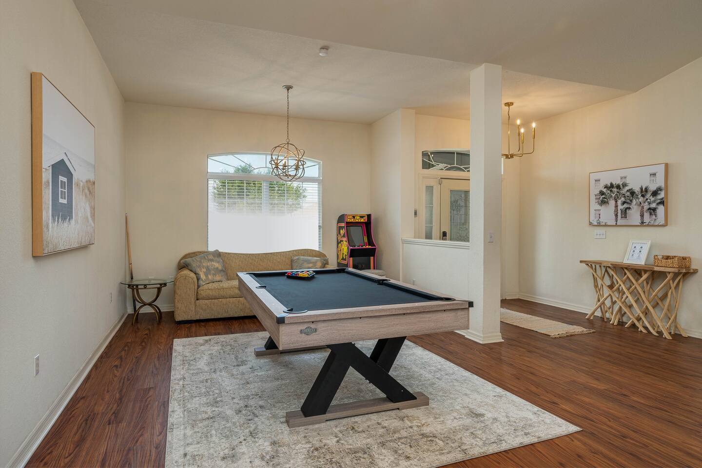 Relax, in the luxury message chair in the living room. Fully equipped kitchen. Dinning seating for 6, plus 2 bar seats at kitchen counter. Back patio features a screened in lanai to enjoy the hammock. As well as outdoor couch furniture and a stone firepit to enjoy with the family. All within your turf fenced in backyard.