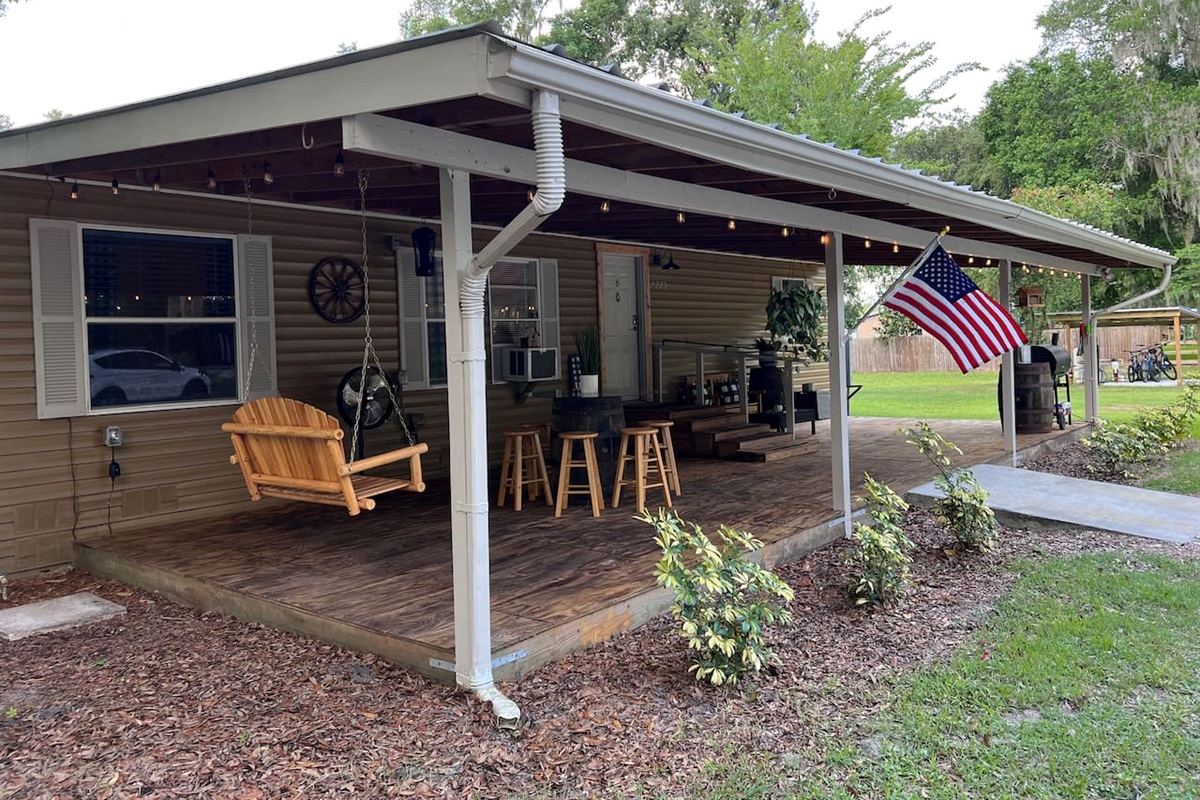 Located in Webster Fl. But only 10 minutes drive to Groveland, 9 minutes to Mascotte, 18 minutes to Clermont, 22 minutes to Bushnell, 26 minutes to Minneola, 55 minutes to the west coast, 50 minutes to Disney World in Orlando. Peaceful country, yet modern farmhouse style blend. 2 full bedrooms and 2 full remodeled bathrooms, huge covered front porch and deck with outdoor dining area, side deck for sunning, large yard and Fire pit. 3 bicycles provided for guests to ride the nearby trails. Board games and outdoor games provided such as cornhole. Fast internet (starlink)